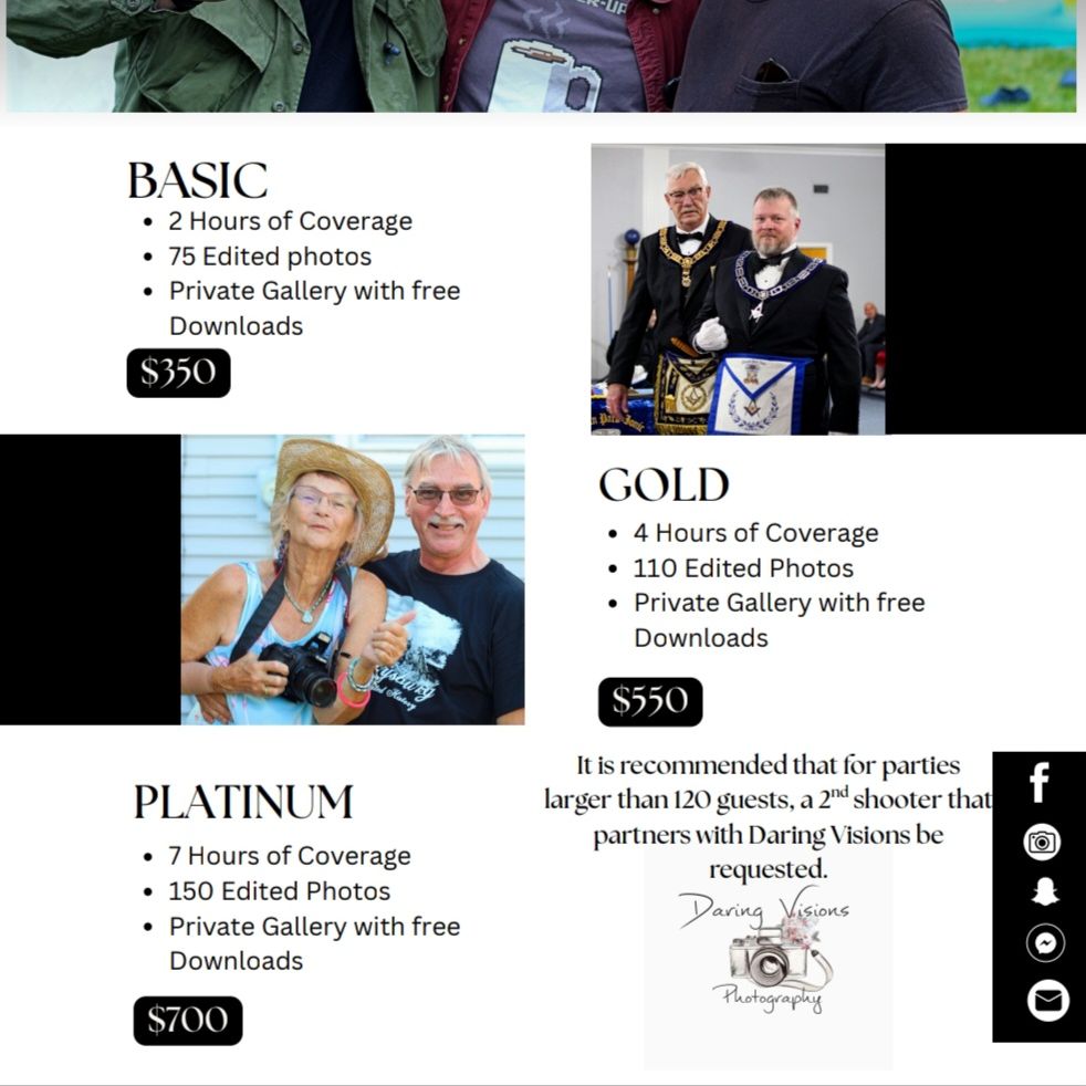 From intimate gatherings to large celebrations, Daring Visions Photography captures the energy, emotion and unforgettable moments of every event. With a creative eye and attention to detail, I ensure your memories are preserved through vibrant, storytelling images that let you relive the experience for years to come.